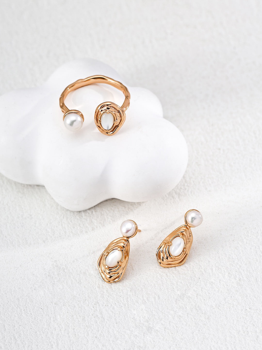 Der Ring aus warmem, goldfarbenem S925-Silber im Retro-Look besticht durch ein architektonisches Lavastrom-Design, das die rohe Energie von in der Zeit erstarrtem, geschmolzenem Gestein einfängt. Sorgfältig ausgewählte blaue Türkise und weiße Perlmuttsteine erzeugen einen faszinierenden visuellen Dialog, während die Naturperle der modernen Ästhetik einen Hauch zeitloser Eleganz verleiht.
