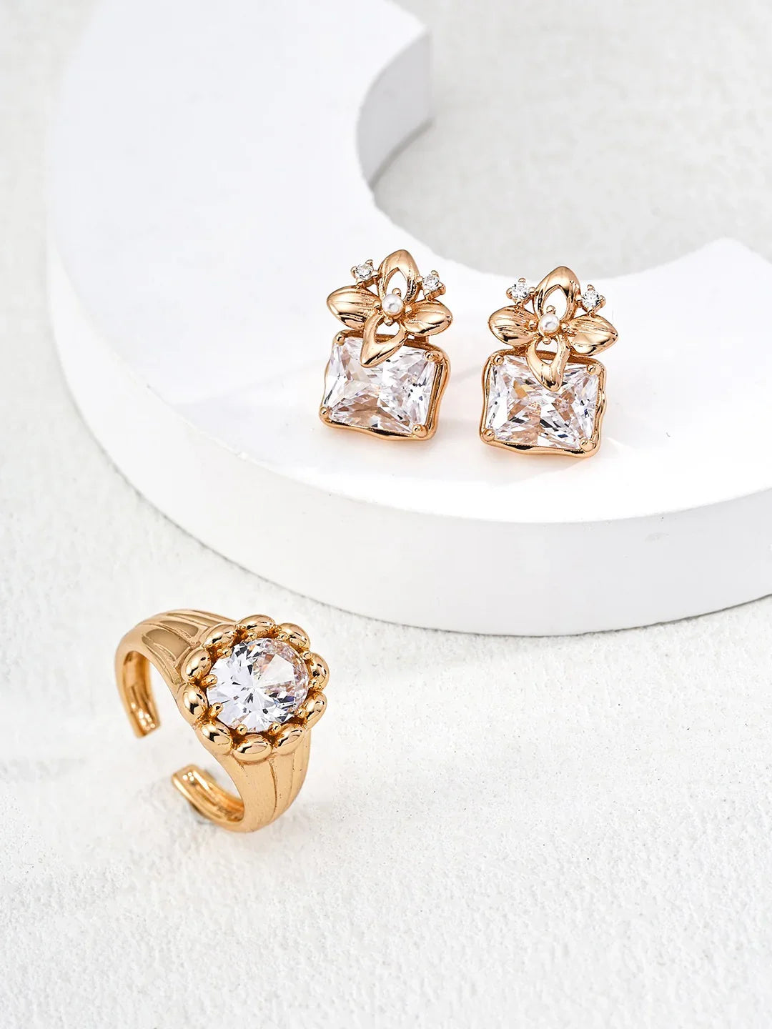 The architectural design features layered geometric planes and angular lines, creating dramatic depth and dimension reminiscent of luxury jewelry houses' most iconic creations. Premium cubic zirconia stones sparkle brilliantly against the backdrop of polished S925 silver, available in both timeless retro gold and contemporary rhodium finishes to suit your personal style.